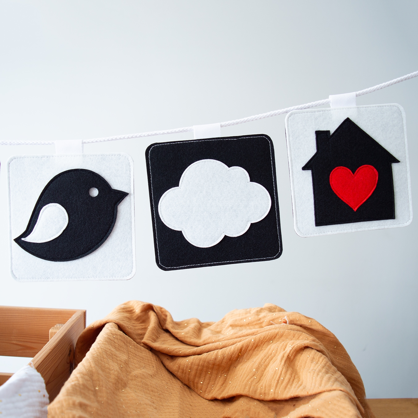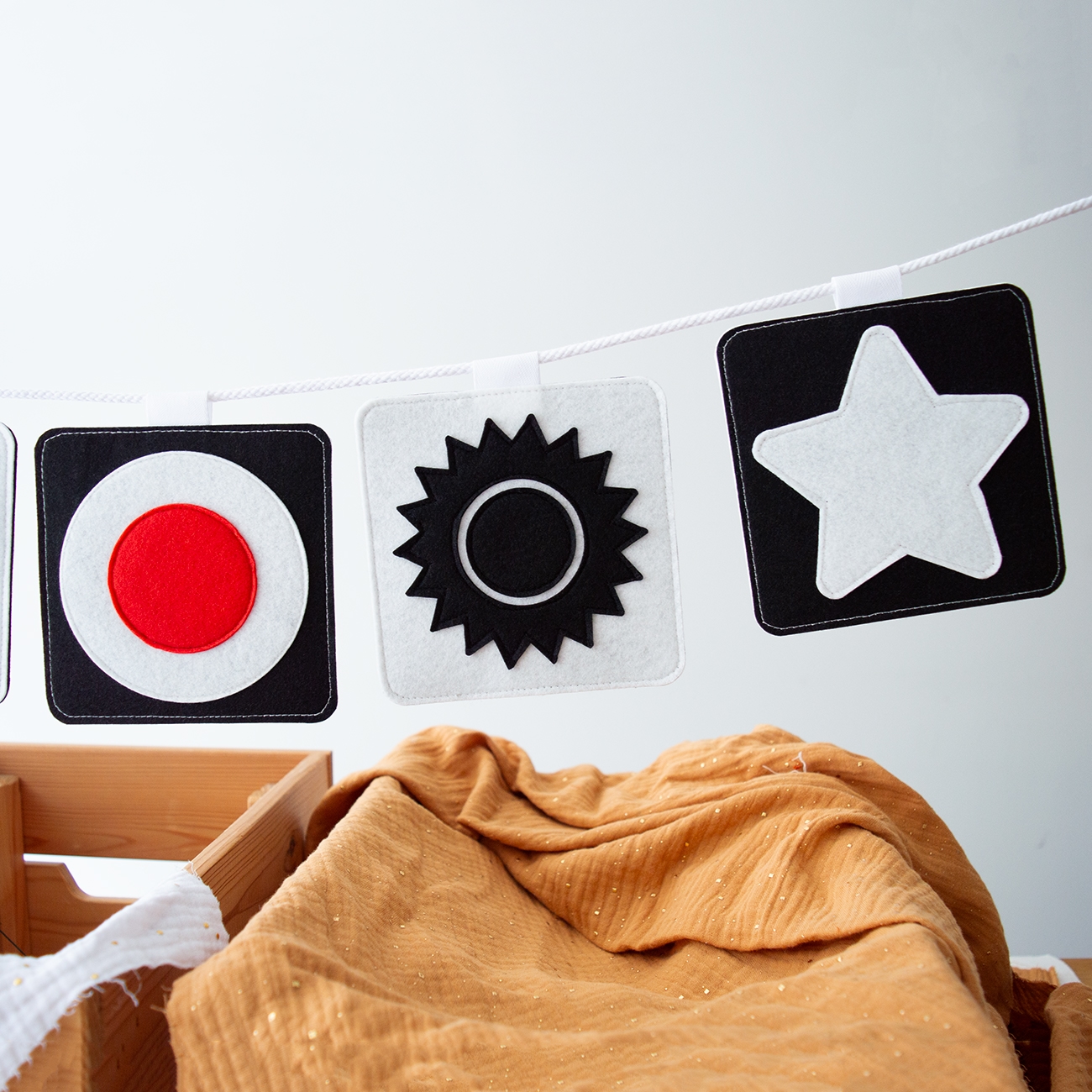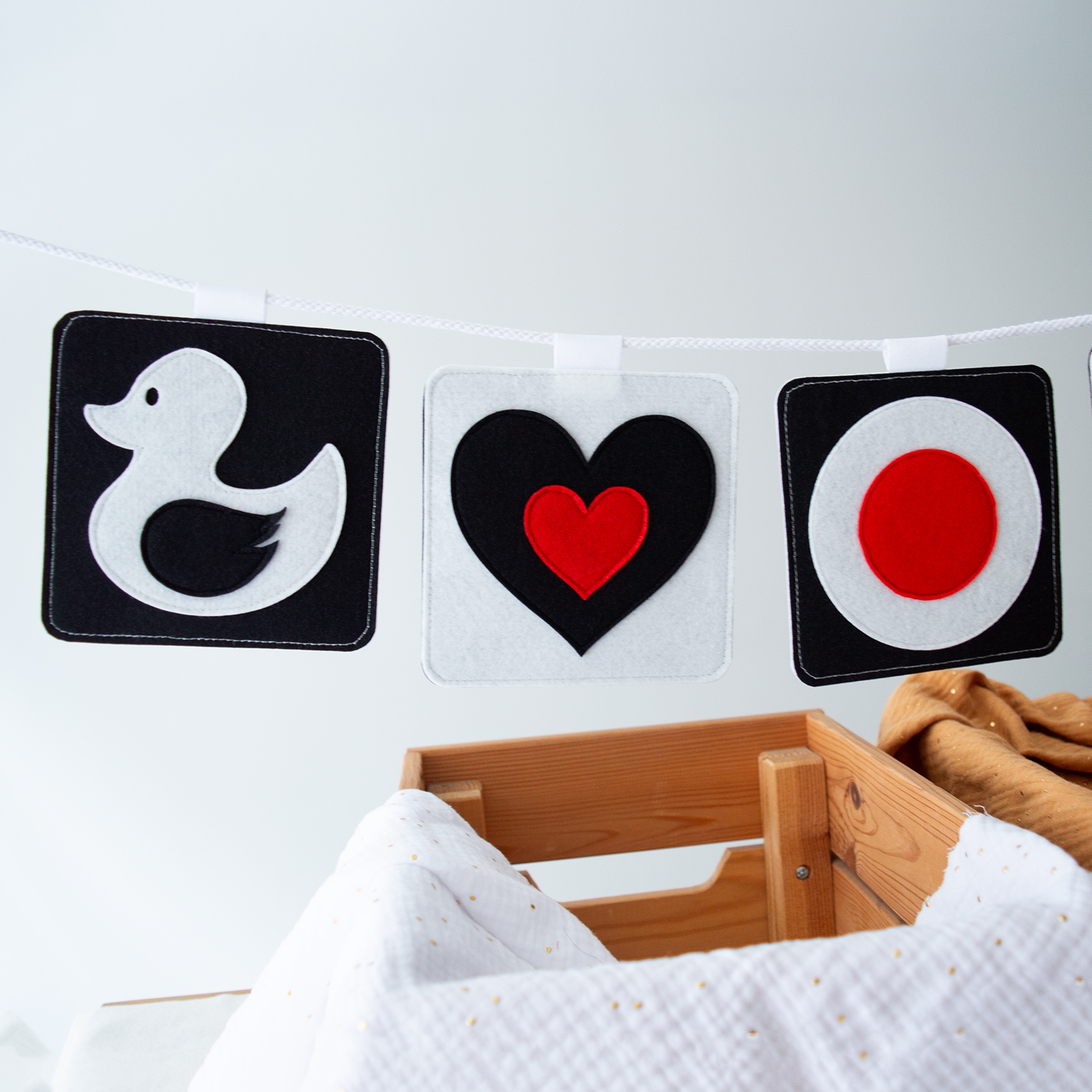 • Με βαμβακερό κορδόνι (περιλαμβάνεται), μπορούν να κρεμαστούν στην κούνια ή το καρότσι για να τραβούν την προσοχή (ιδανικό μέγεθος).