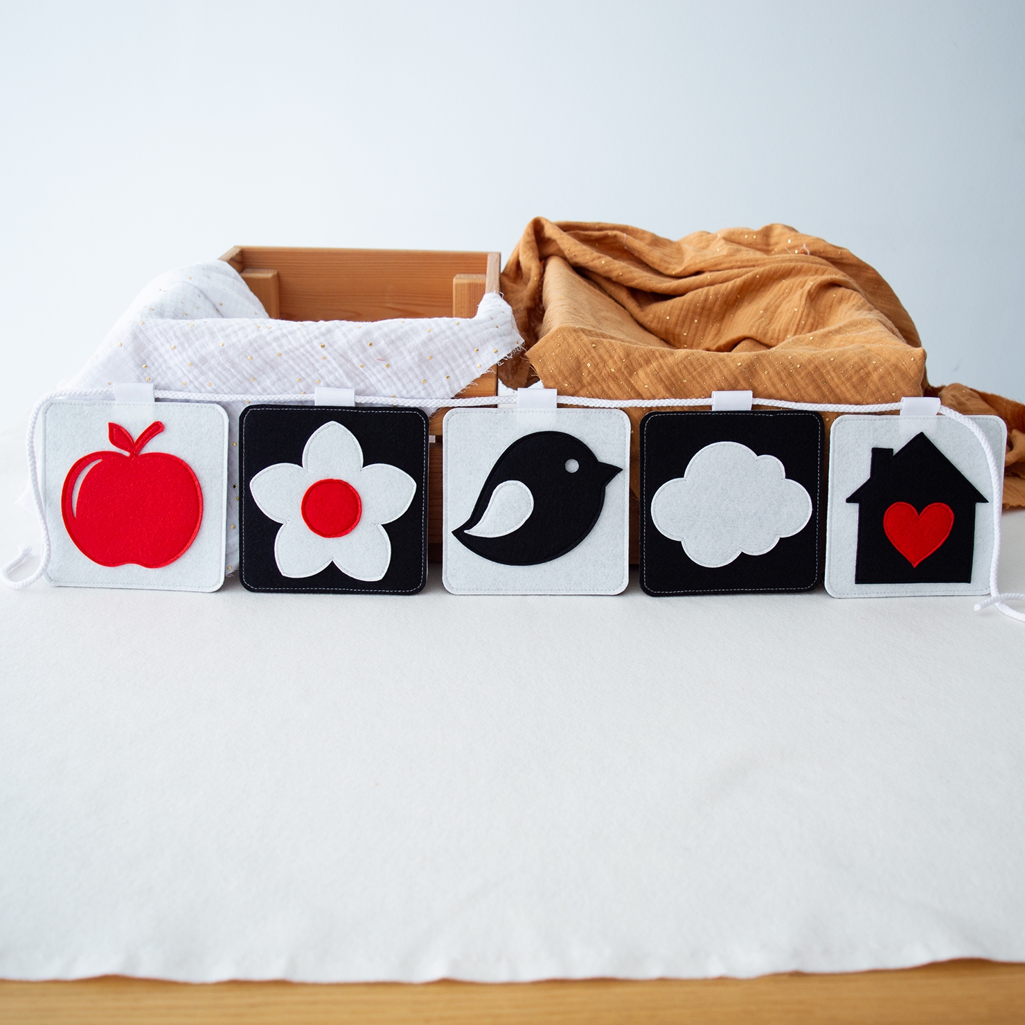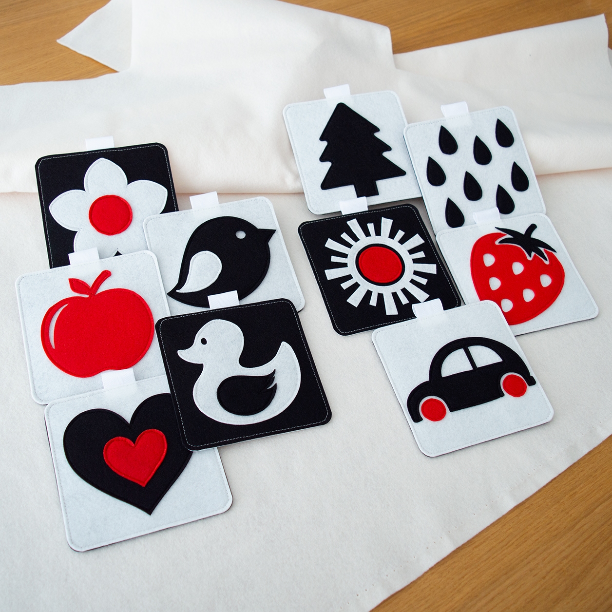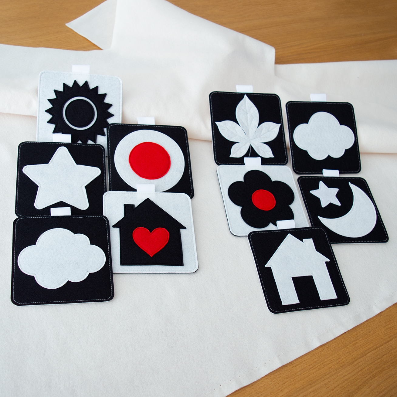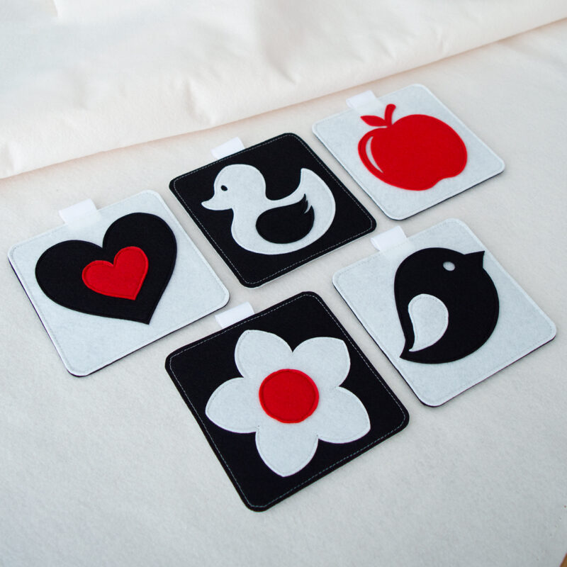 Το σετ περιλαμβάνει 5 τσόχινες κάρτες διπλής όψης, μεγέθους 12 × 12 εκ. η κάθε μία, σχεδιασμένες ειδικά για τα πρώτα στάδια ανάπτυξης του μωρού. Όλες οι κάρτες είναι ασπρόμαυρες, με μερικά σχέδια να έχουν κόκκινα στοιχεία που τραβούν την προσοχή και εισάγουν τα παιδιά στα πρώτα χρώματα, με τρόπο κατάλληλο για τα μάτια που μόλις αρχίζουν να αναπτύσσονται.