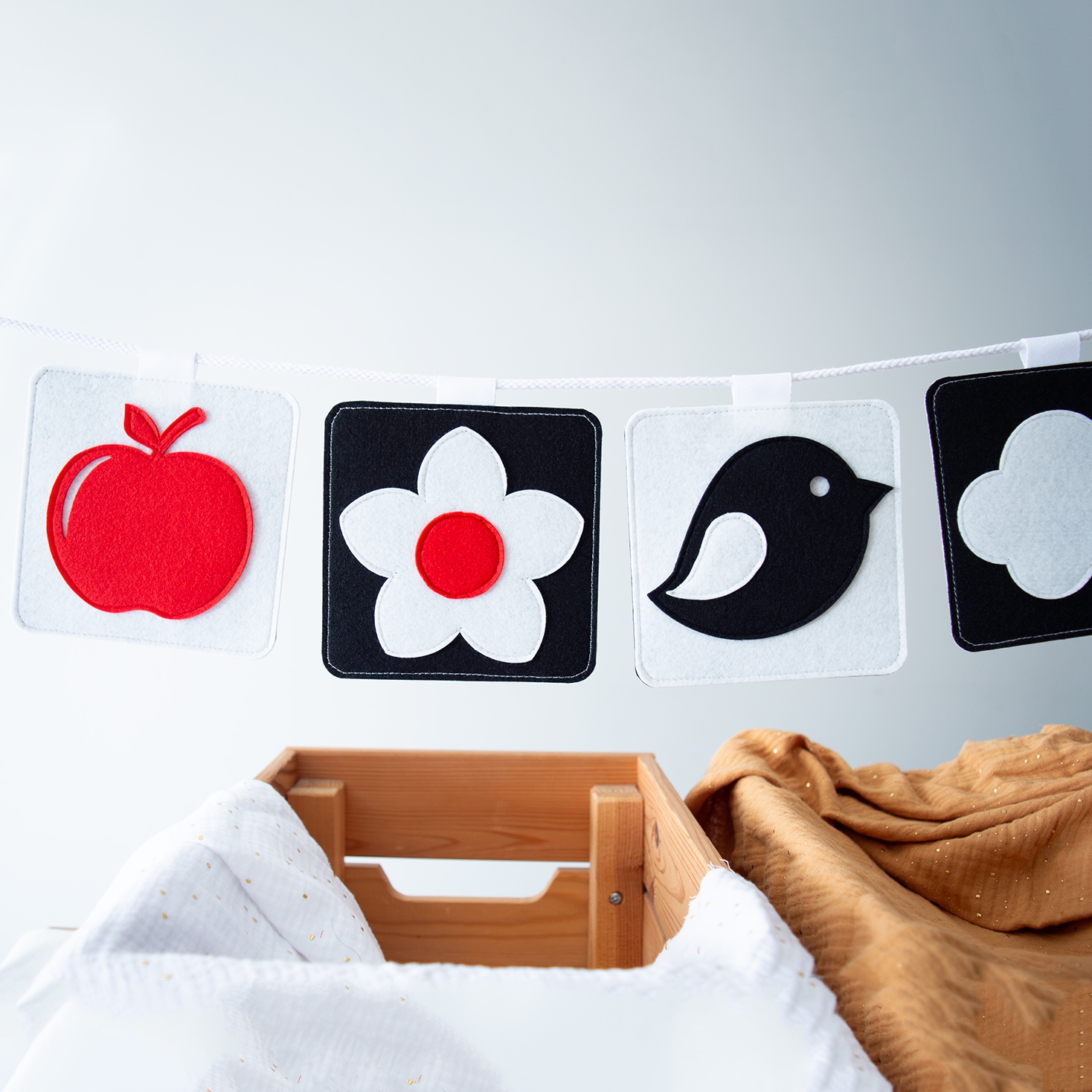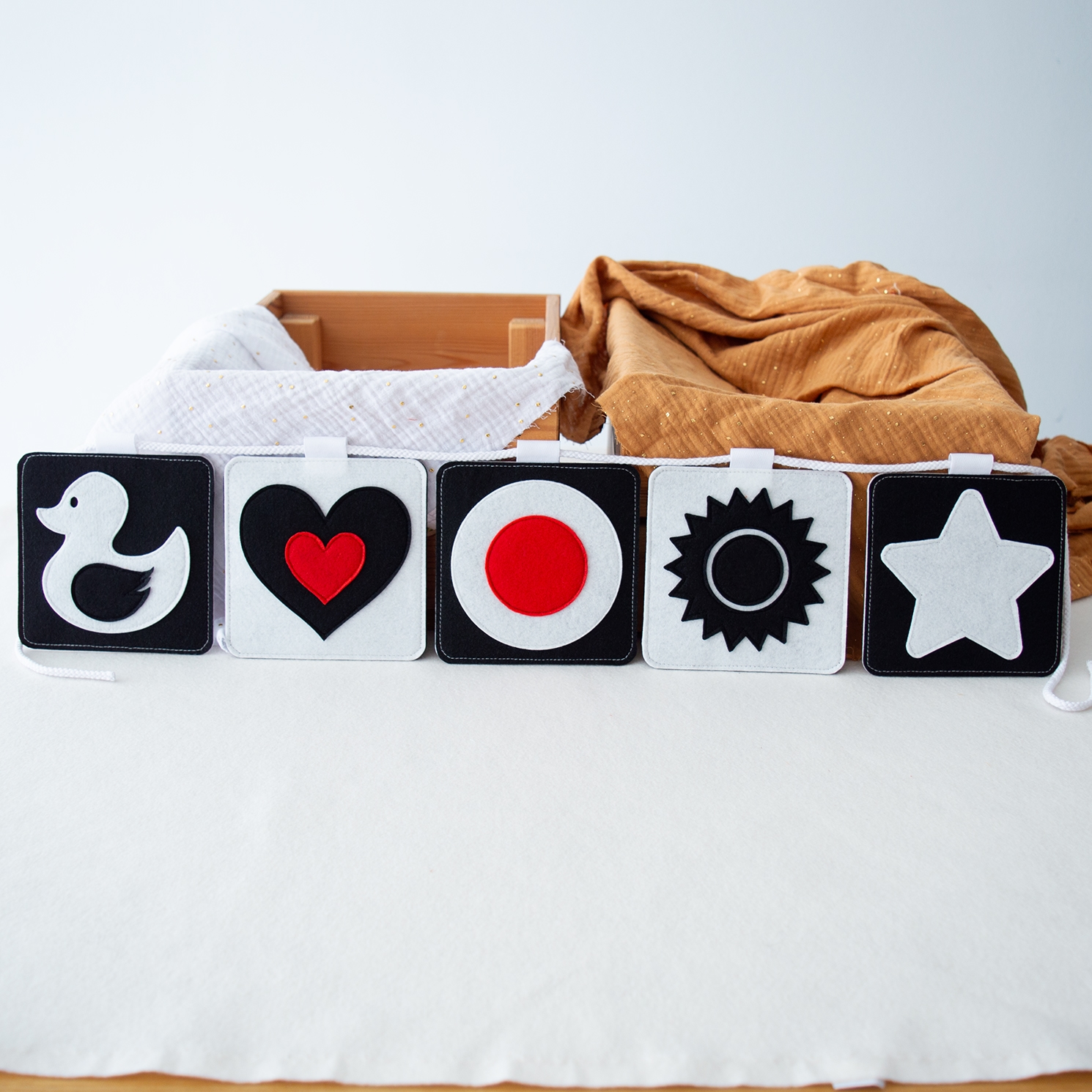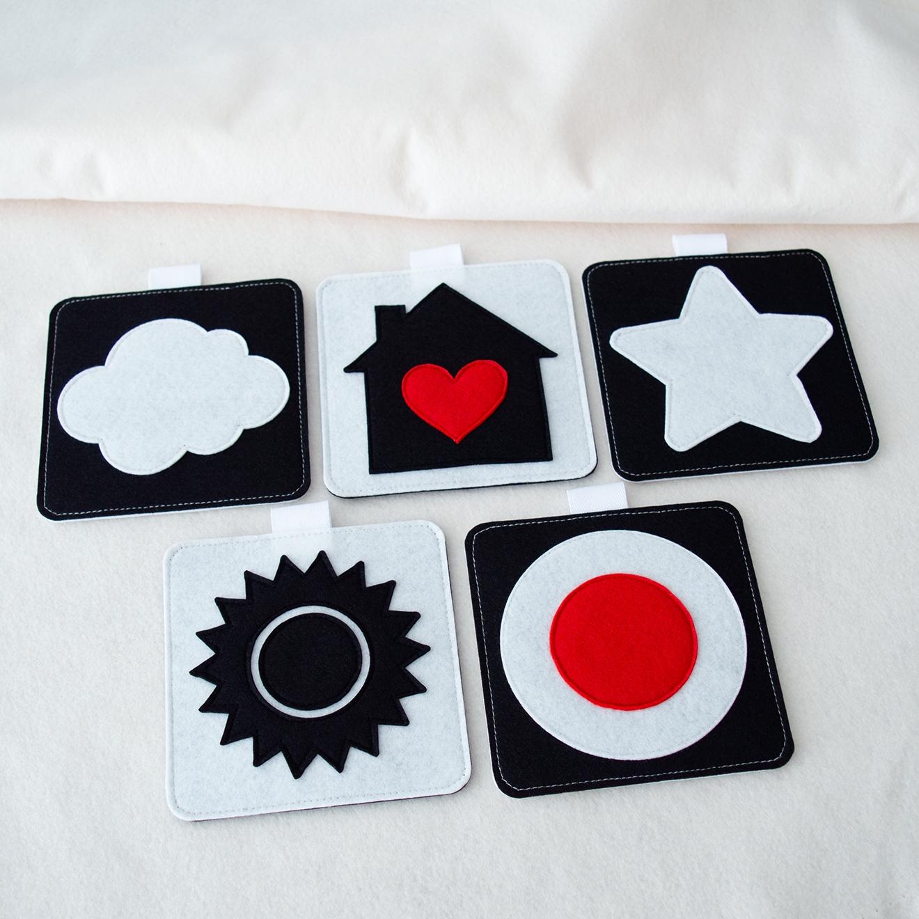 Το σετ περιλαμβάνει 5 τσόχινες κάρτες διπλής όψης, μεγέθους 12 × 12 εκ. η κάθε μία, σχεδιασμένες ειδικά για τα πρώτα στάδια ανάπτυξης του μωρού. Όλες οι κάρτες είναι ασπρόμαυρες, με μερικά σχέδια να έχουν κόκκινα στοιχεία που τραβούν την προσοχή και εισάγουν τα παιδιά στα πρώτα χρώματα, με τρόπο κατάλληλο για τα μάτια που μόλις αρχίζουν να αναπτύσσονται.