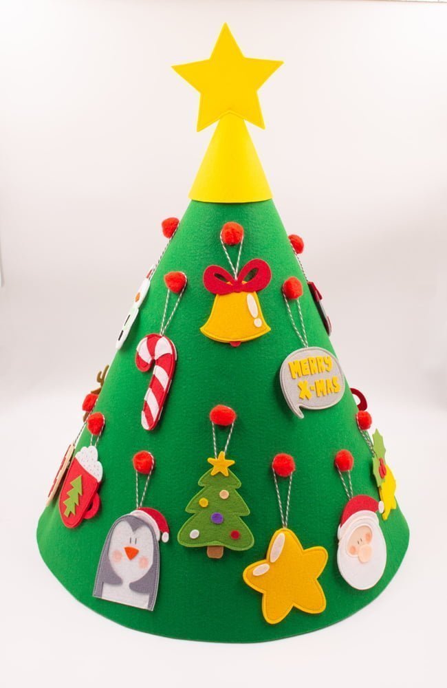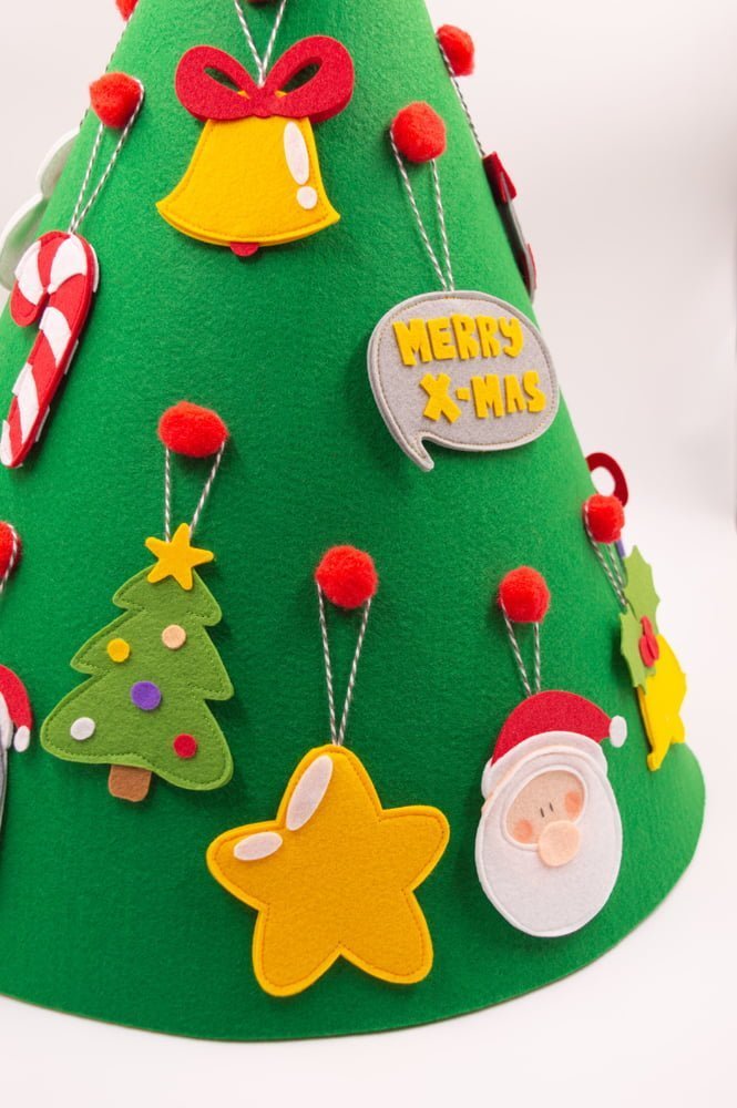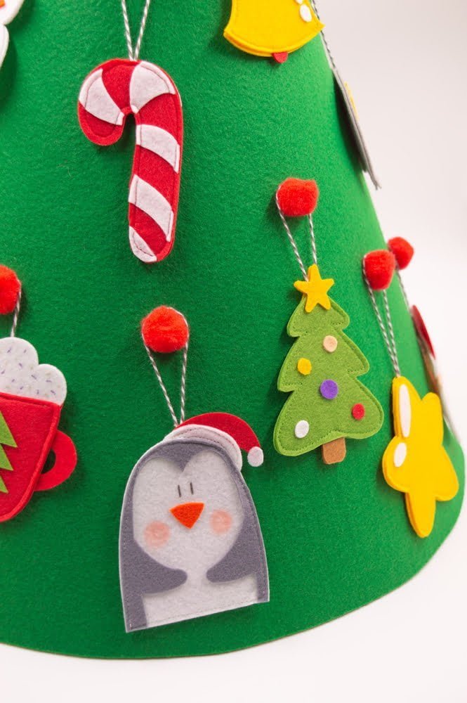 Ας στολίσουμε το απαλό τσόχινο Χριστουγεννιάτικο δέντρο μας με 18 όμορφα και πολύχρωμα στολίδια. Μην ξεχάσουμε όμως το αστέρι για την κορυφή!