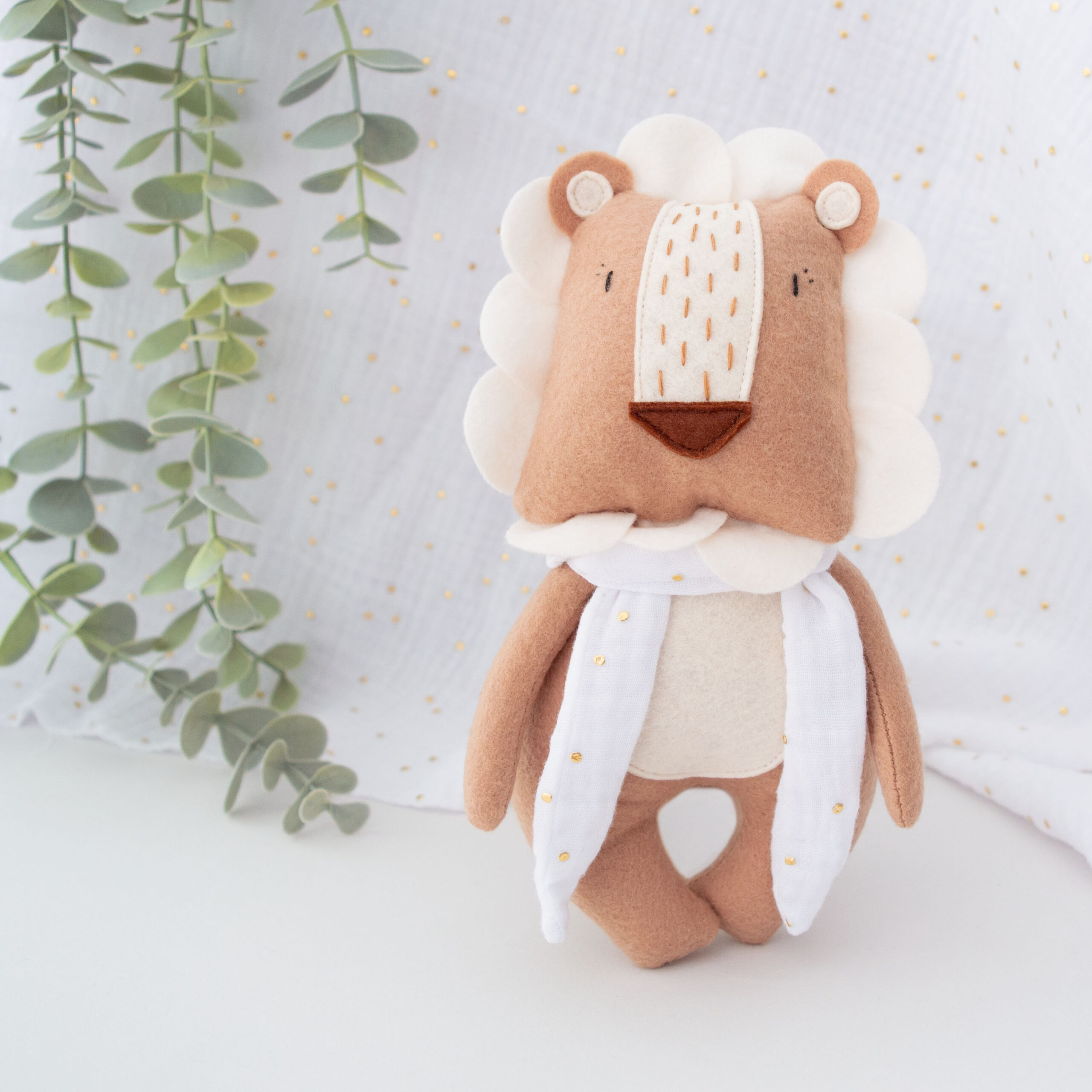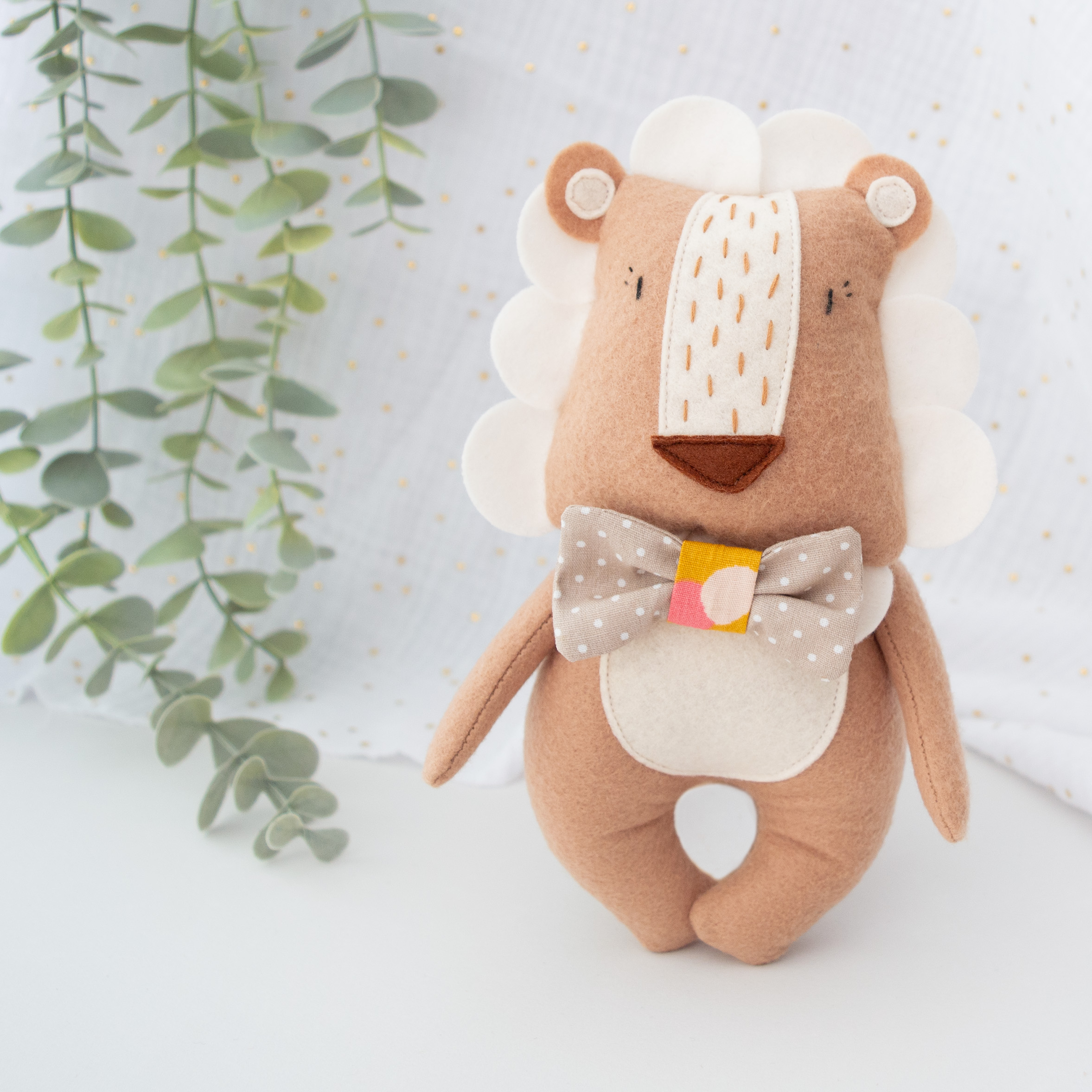 Λιοντάρι, τρυφερό και καθόλου άγριο, που αγαπάει τις αγκαλιές και το παιχνίδι. Φοράει τα καλά του και περιμένει τους φίλους του.